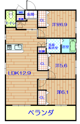 | 間取り | 3LDK(洋5.6 洋6.1 洋6.9 LDK12.9) | 駐車場 | 有(空有り/敷地内) 2台(2台無料 並列) |